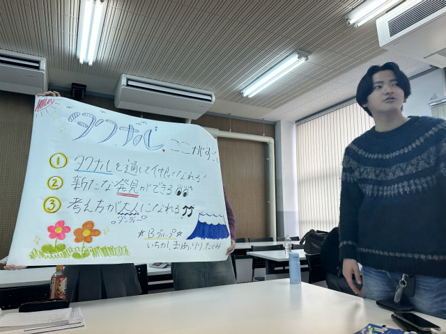 完成した模造紙や発表方法にはさまざまな工夫が盛り込まれており、どのグループも創意工夫がみられる内容となっていました。学生たちが自ら考え、まとめる力を確実に身につけていることを改めて感じることができました。