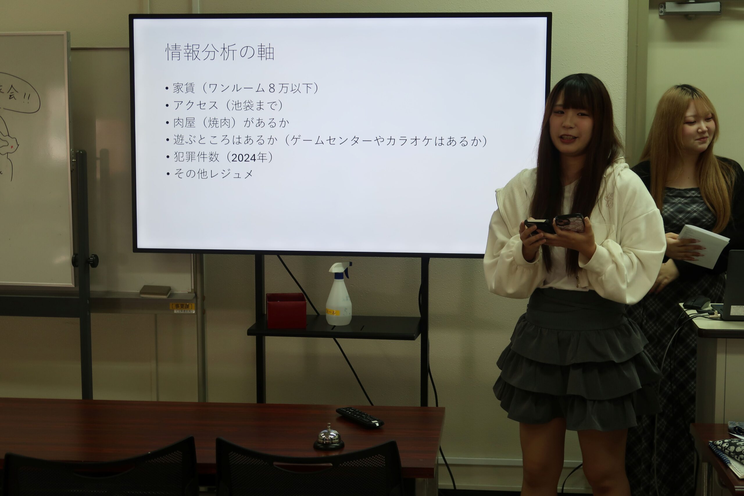 次に、「新入生におすすめの住む街を提案しよう」というテーマで、それぞれのチームで情報を集め、分析して発表しました。具体的には赤羽、朝霞台、南千住、中野(街はTAで話し合い決定しました)の4つの候補の中から、
