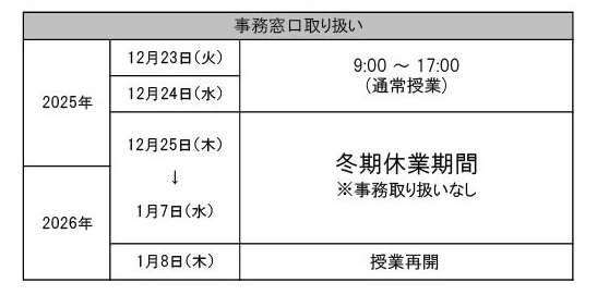 また、冬期休業期間中の事務窓口取り扱い時間は下記表の通りです。