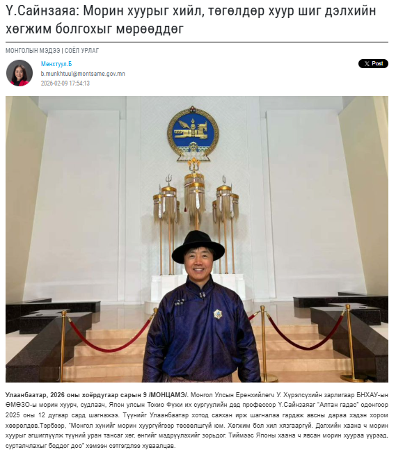 ウランバートル、2026年2月9日 /モンツァメ(国営通信)/。