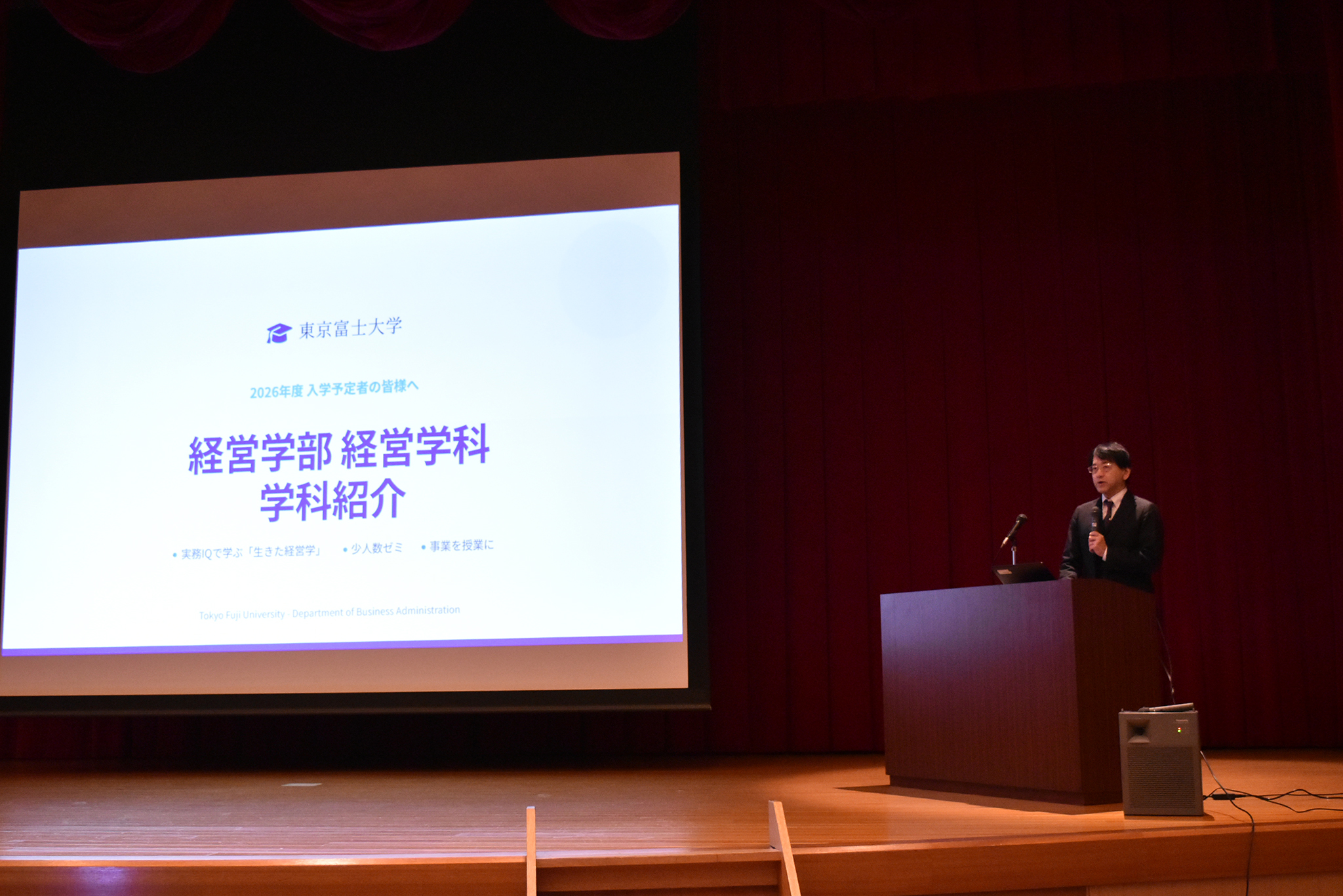 青山学長の開会の挨拶に続き、学務課員より「学生生活について」の話があり、その後「実務IQドリル」の説明や経営学科・イベントプロデュース学科の紹介が隅田(経営)学科長、北原(イベントプロデュース)学科長から行われ、最後に浮谷学部長より閉会の挨拶をいただき無事に閉会いたしました。